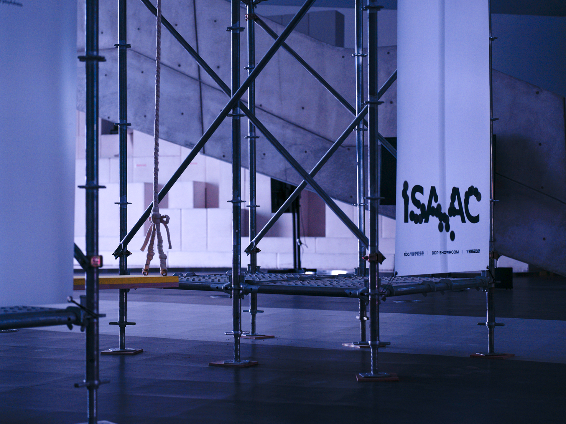 오래된 물건들이 수면 위로 떠오르고 사라짐을 반복하는 영상을 그네를 타고 관람하는 ISAAC은